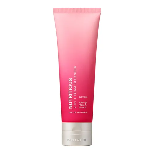 Estee Lauder Nutritious 2-in-1 Foam Cleanser. Kemasannya berwarna pink ombre yang cerah, dari pink muda di bagian atas hingga fuchsia di bagian bawah. Labelnya berwarna putih dengan tulisan “NUTRICIOUS 2-IN-1 FOAM CLEANSER” dan klaim manfaat “PURIFY, PORES, GLOW”, menunjukkan ini adalah pembersih wajah multifungsi yang berfokus pada pembersihan dan pencerahan kulit.