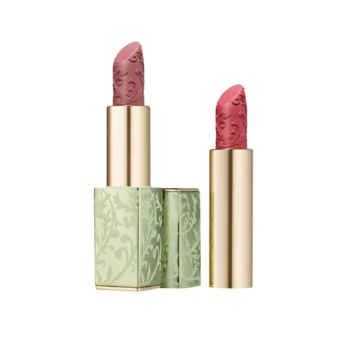 Estee Lauder Pure Color Explicit Silk Matte. Produk ini hadir dalam kemasan ramping berwarna emas yang elegan. Batang lipstik berwarna nude atau merah muda kecoklatan yang lembut, mengindikasikan hasil akhir matte yang halus.